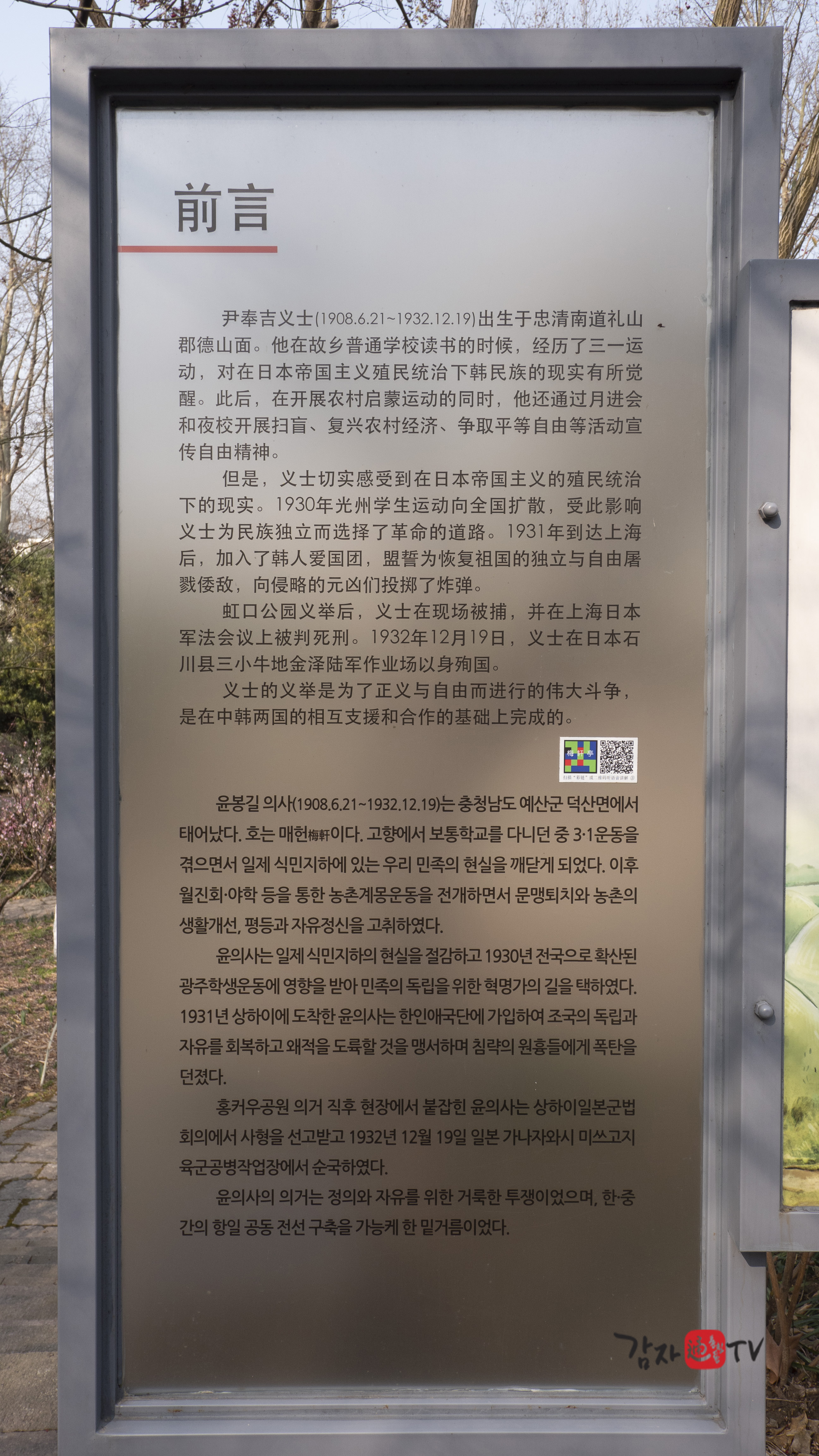 윤봉길의사가 투탄의거를 결행했던 홍구공원의 이름은 현재 ‘노신공원’으로 바뀌었다.